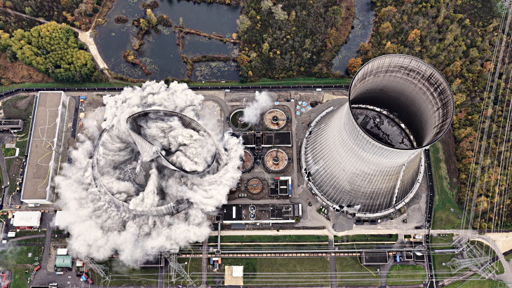 About 600 kilograms of explosives in a total of 1,800 boreholes were required to demolish the two cooling towers. The approximately 56,000 tonnes of material will be processed into recycled gravel, a sought-after construction material.