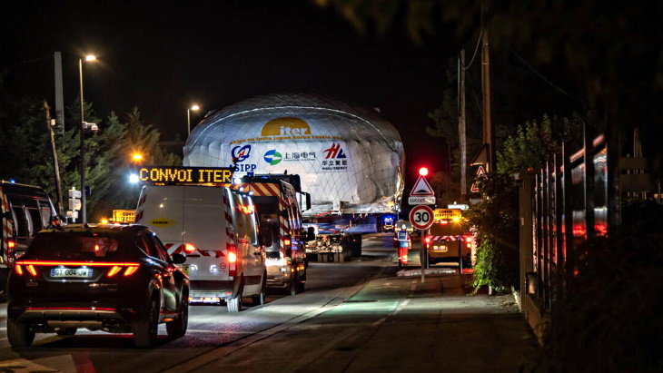 Equipped with an 800-horsepower power pack, the convoy carrying the "highly exceptional load" arrived at ITER in the early hours of 4 October. The cryostat - the longest and widest component so far to be transported from the port to Cadarache - had travelled along the route over the previous five nights. No ITER convoy until now has taken more than four nights to travel the route.