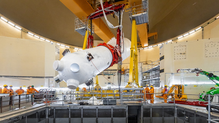 The first steam generator - measuring 20 metres in height and weighing 365 tonnes - was detached from its installation position inside the reactor building on 20 January, gradually lifted, tilted and rotated several times, before finally being placed in front of the new controlled area barrier.